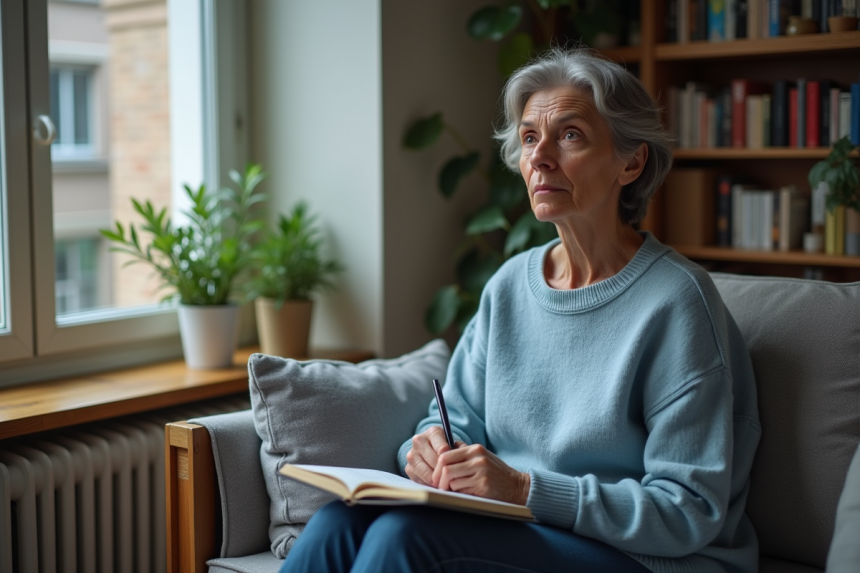 Femme d'âge moyen journalisant dans un salon cosy